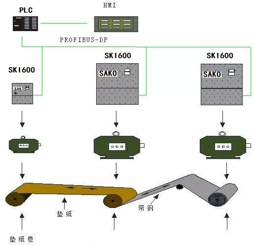 HMI作為操作工藝參數(shù)的輸入部分,是人機(jī)交互界面,通過輸入不同的參數(shù)來實(shí)現(xiàn)不同鋼材卷取要求。PLC作為控制器進(jìn)行運(yùn)算控制,協(xié)調(diào)各個變頻器工作。為了滿足高速響應(yīng)性,系統(tǒng)采用PLC和以及三科SKI600進(jìn)行PROFIBUS-DP協(xié)議通信