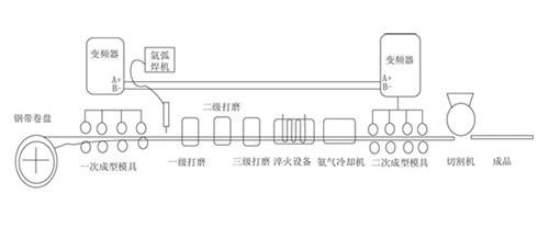 半成品不銹鋼帶整卷放置在放卷機(jī)架上面(被動(dòng)放卷),在1#變頻器驅(qū)動(dòng)下,鋼帶通過(guò)一次成型模具(多個(gè)模具)將鋼帶逐級(jí)卷成管狀,通過(guò)下一個(gè)環(huán)節(jié)---氬弧焊接設(shè)備對(duì)著閉合口進(jìn)行連續(xù)不斷的焊接。然后進(jìn)入三級(jí)加濕打磨將焊接點(diǎn)打磨光潔無(wú)痕。淬火使不銹鋼材質(zhì)變得更加適應(yīng)各種惡劣場(chǎng)合。又通過(guò)第二次成型還可對(duì)成品直徑進(jìn)行校正,保證產(chǎn)品的合格率。最后根據(jù)要求將不銹鋼管通過(guò)切割成不等長(zhǎng)度的成品。