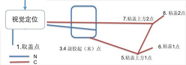 8)回到取蓋上方點(diǎn),等待進(jìn)入粘蓋下一次循環(huán)。