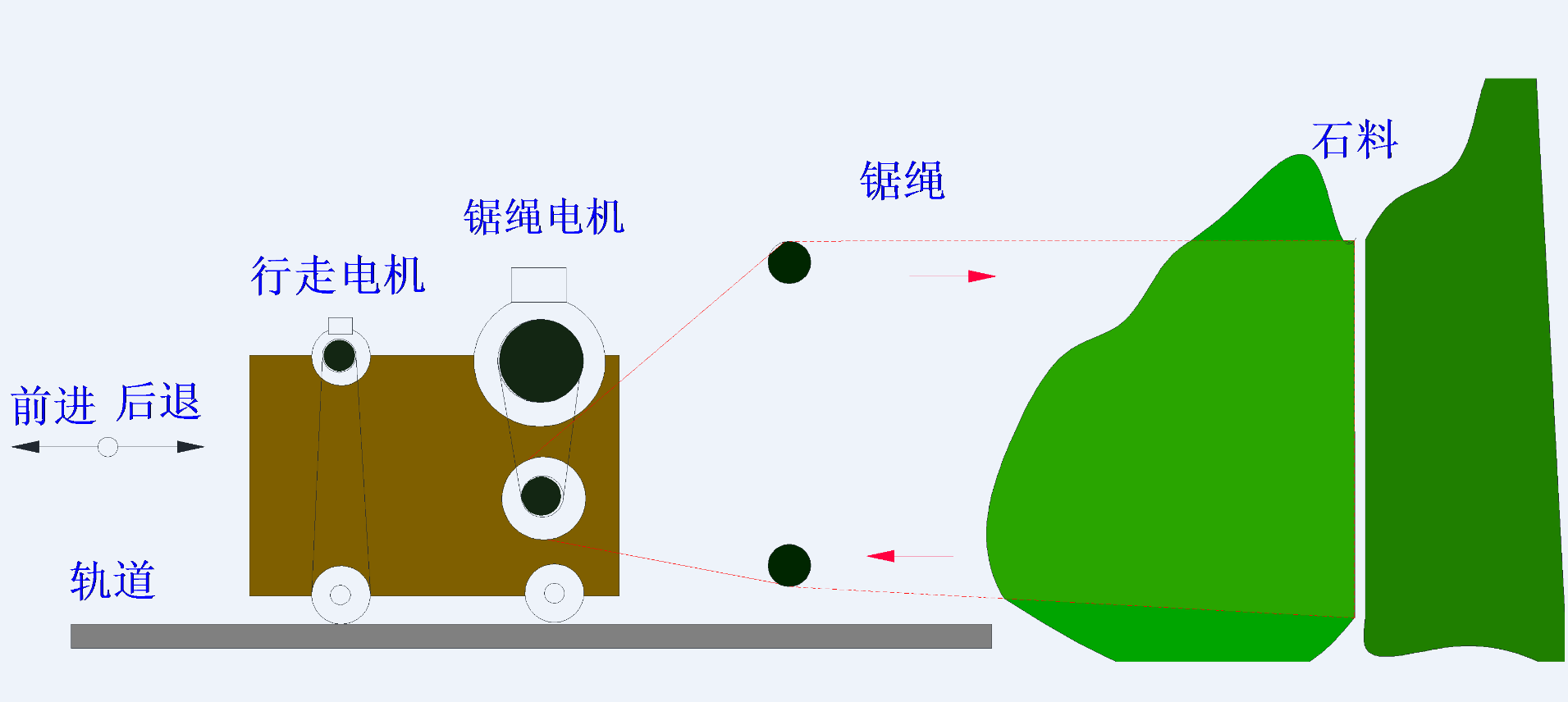 3、礦山切割面往往是不規(guī)則,繩鋸機鋸床移動速度必須根據(jù)切割面積與負(fù)荷的變化實時調(diào)整。移動太快造成過載或繃斷鋸繩;移動太慢鋸繩張力太小打滑造成鋸繩松弛打絞,絞斷鋸繩。