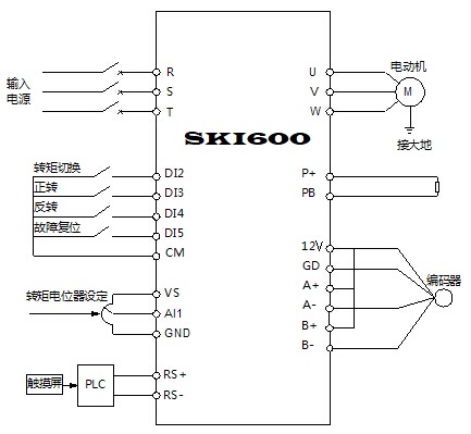 牽引系統(tǒng)主要由觸摸屏、PLC和SKI600系列變頻器組成。在通過SKI600完成閉環(huán)矢量模式控制的同時,與PLC之間進(jìn)行高速通訊來實(shí)現(xiàn)轉(zhuǎn)速模式和轉(zhuǎn)矩模式的切換以及允許頻率和電流等數(shù)據(jù)的交換。