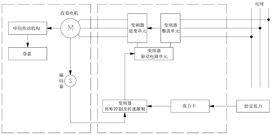 如下圖所示,收卷的恒張力控制,是按照工藝將系統收卷所需的張力及空、滿盤卷徑設置到張力卡,張力卡根據運行線速度,計算出當前卷徑,進而得到收卷所需的轉矩并將其給到后再進行轉矩控制。在收卷過程中,系統可自動實時計算當前的卷徑,以保證收卷張力的恒定。同時系統張力錐度的設置可使材料較好的卷曲成型。