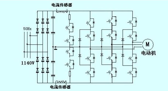 (3)更換保險(xiǎn)絲后,機(jī)柜正常上電,工頻啟動(dòng)并正常工作,工頻維修結(jié)束。然后維修變頻部分。主電路如圖1所示。