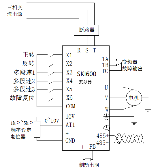 該現(xiàn)場采用易能PLC、SKI600-VFD和SK-MD204觸摸屏。PLC控制系統(tǒng)與人機界面之間采用標(biāo)準(zhǔn)的modbus通訊協(xié)議,準(zhǔn)確讀取變頻器的狀態(tài)信息??刂葡到y(tǒng)與變頻器之間采用多段速的控制方式,方便客戶準(zhǔn)確選擇不同的線體速度。