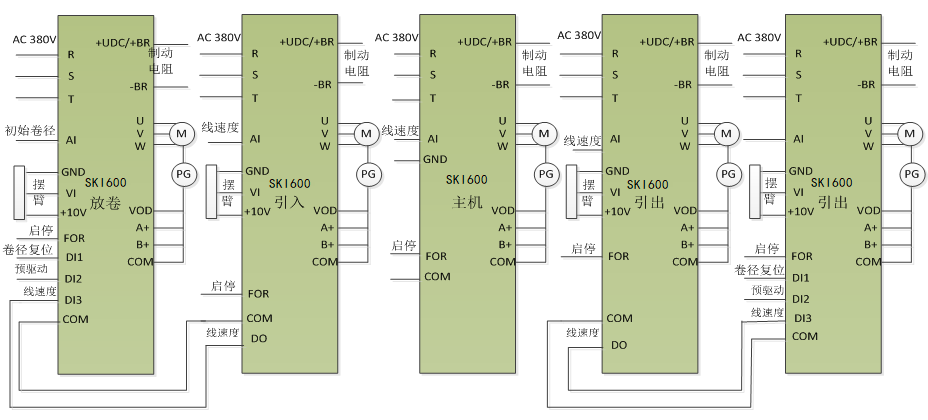 而牽引的運行頻率給到收卷和放卷做線速度信號,初始卷徑是由PLC給定的,而線速度與初始卷徑相結(jié)合就得出了收放卷通用變頻器的主頻率,再根據(jù)擺臂反饋回來的信號由PID自動計算出一個頻率(輔助頻率),二者相加,實現(xiàn)收放卷的橫張力控制。主機、牽引和收放卷變頻器采用速度閉環(huán)模式,確保了控制的精度;采用預(yù)驅(qū)動功能實現(xiàn)可高速接料不停機功能,提高了生產(chǎn)效率,為客戶降低成本。