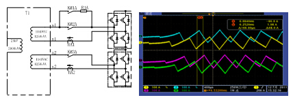 鐵路上供電電源為單相25kV,試驗臺的電源是鐵路電網(wǎng)中取電,采用25kV的電源供電。兩臺變流器中共4個模塊的輸入電流錯相控制,通道1(黃色)和通道2(藍色)為一臺變流器的兩個模塊輸入電流,通道3(紫色)和通道4(綠色),為另一臺變流器輸入電流。